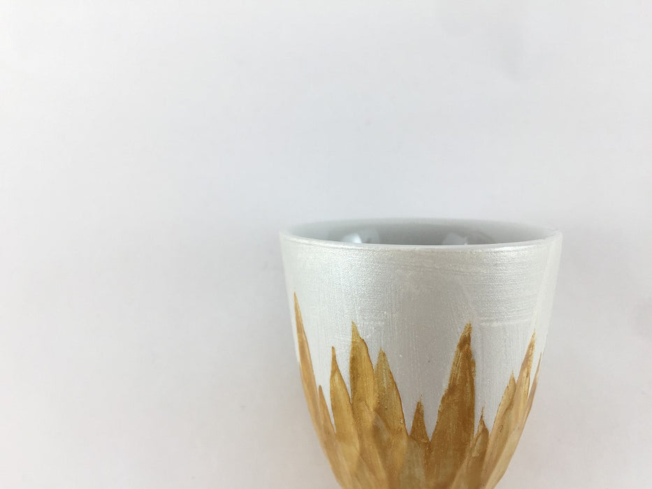 下側に花をイメージした彫が入った盃。金と銀の色合いが上品で美しい。普段使いはもちろん、ちょっと特別な日や贈り物としても喜ばれます。同柄の花彫片口もあります!