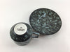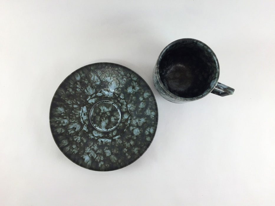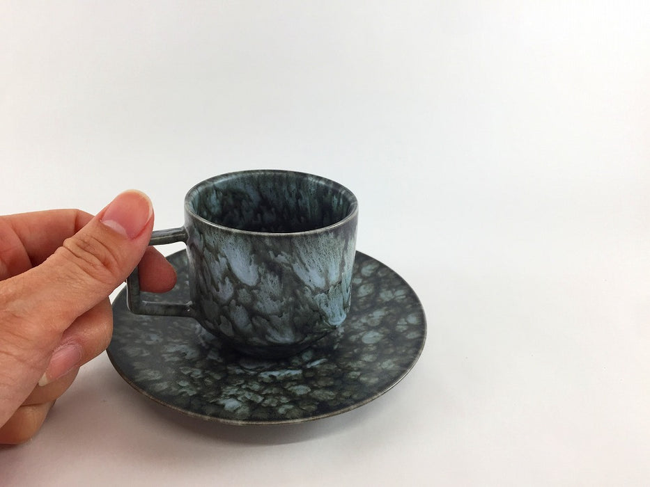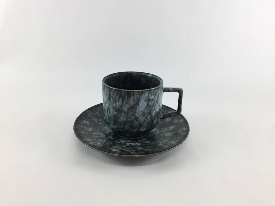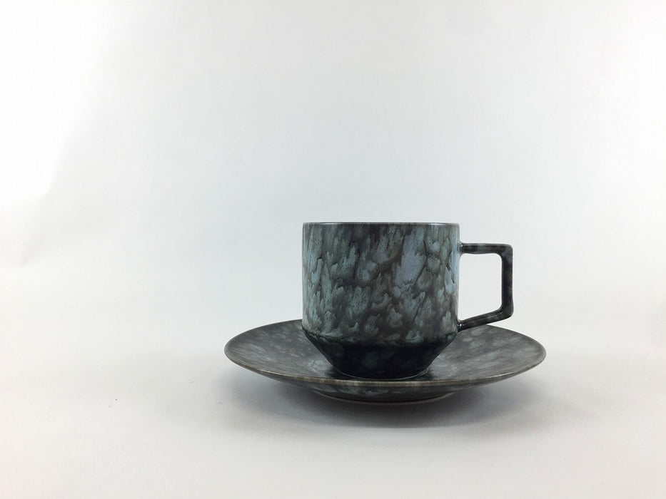 ストンとした形状がおしゃれな珈琲碗皿。取っ手が細くて持ちやすい。一つ一つ模様の出方が違う、面白い黒です。